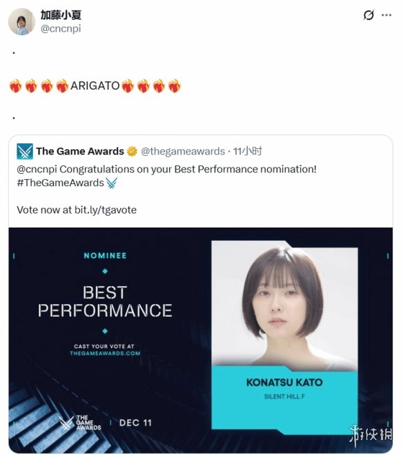 提名名单发布后,加藤小夏通过个人社交媒体转发了TGA官方公告,并对此次入围表达了谢意。
