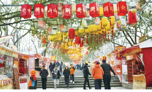 2月3日,随着春节脚步临近,千佛山风景名胜区装饰一新,喜迎佳节。景区北门登山主路上方已挂起千余盏灯笼,它们花色各异、图案纷呈,并以黄色为主调,串联成百米长的璀璨灯河,将在春节假期的夜晚全部点亮,为市民游客照亮迎新登高之路。 济南时报·新黄河客户端记者王锋 摄